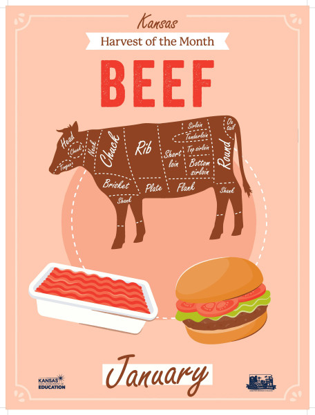 School districts and early care and education programs across Kansas are promoting locally raised beef in January. Beef is featured as the January Harvest of the Month, a program that celebrates one Kansas-grown or raised product each month of the year to promote the use of local foods in Child Nutrition Programs. Kansas-raised beef products will be encouraged through various resources including recipes, agricultural education curriculum for Preschool through 12th grade classrooms and promotional materials such as posters, stickers, static clings, newsletters and more.