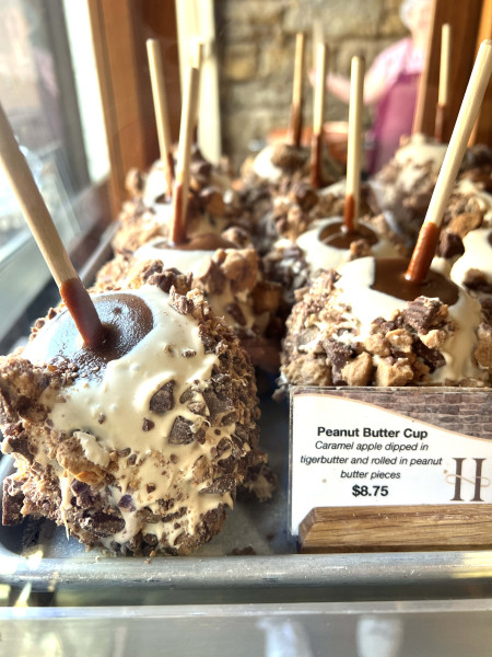 Walking into Hazel Hill Chocolate, one is greeted by shelves of apples coated in caramel, nuts and marshmallows. A woman uses a wooden paddle to mix hot fudge in a copper kettle while occasionally watching passersby through the store’s window. The aroma of cocoa permeates the air as a nearby employee hand-dips cookies into a rotating bowl of melted chocolate.
