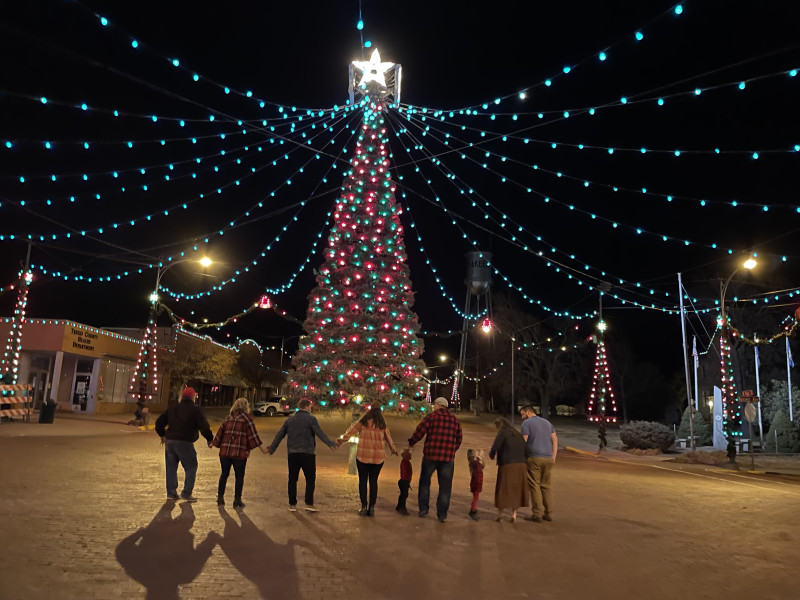 Today, that original frame still anchors the celebration. Volunteers wrap it each year to create a 35-foot live greenery tree topped with a four-foot star. A canopy of blue lights stretches across the town square and handcrafted wreaths, bells and garlands line the four-block downtown. WaKeeney still uses traditional bulbs rather than LEDs, a choice Shubert says preserves the familiar glow visitors remember.